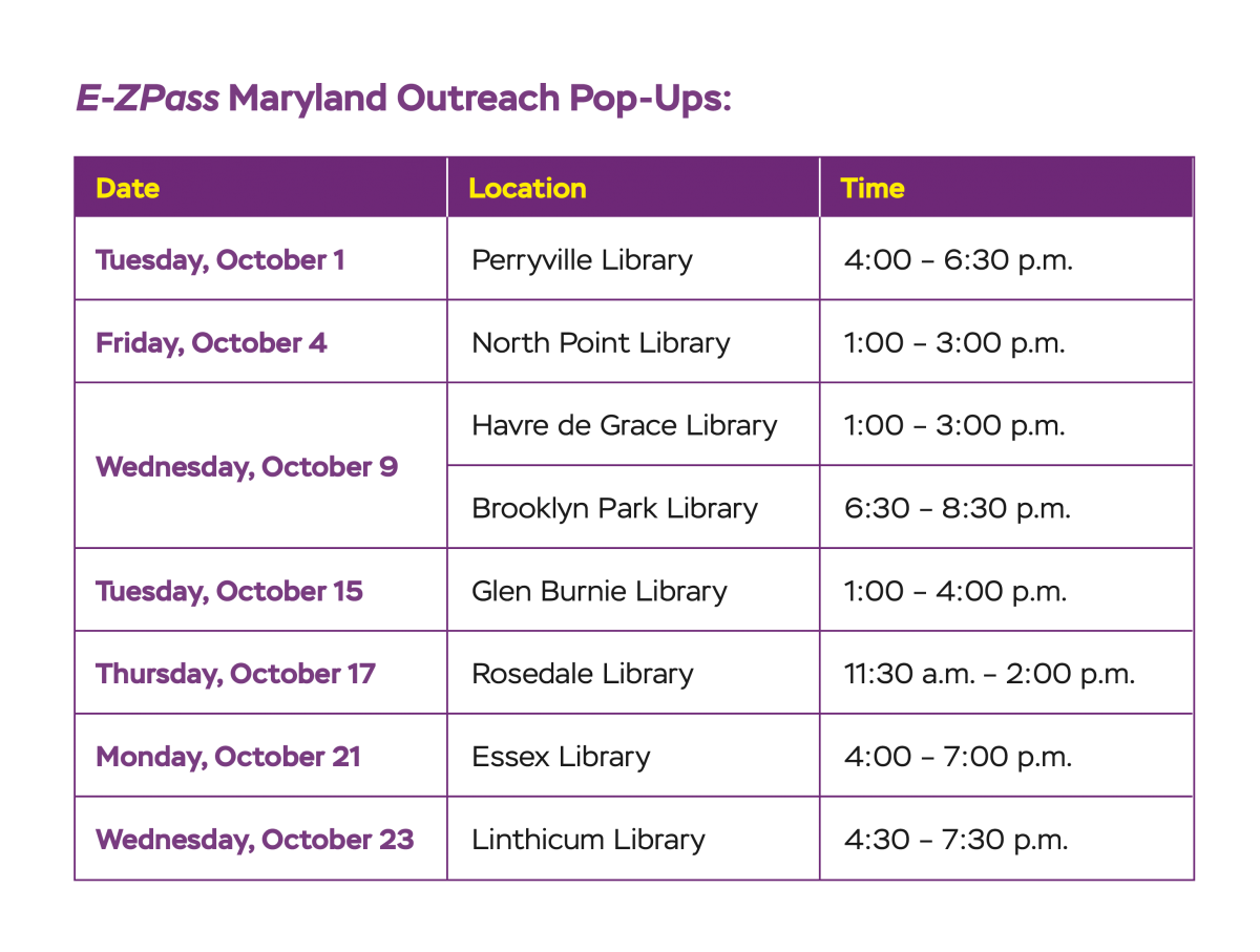 The MDTA’s E-ZPass® Maryland Outreach Team will be at scheduled events to provide free E-ZPass® transponders and to sign up new customers at the following locations.