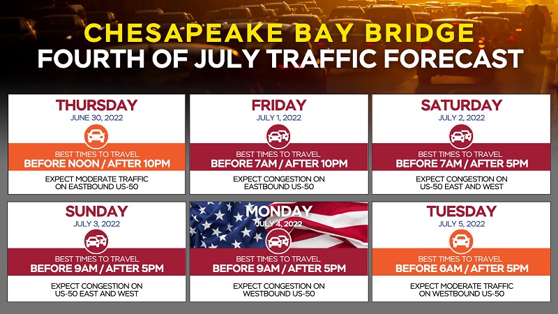 BALTIMORE, MD (June 27, 2022) – As the summer travel season turns its focus toward the Fourth of July, the Maryland Transportation Authority (MDTA) encourages motorists to follow recommend drive times when crossing the Chesapeake Bay Bridge to minimize delays this holiday weekend. Motorists may also find time savings by utilizing the I-95 northern route traveling the Tydings Bridge to and from the Eastern Shore.