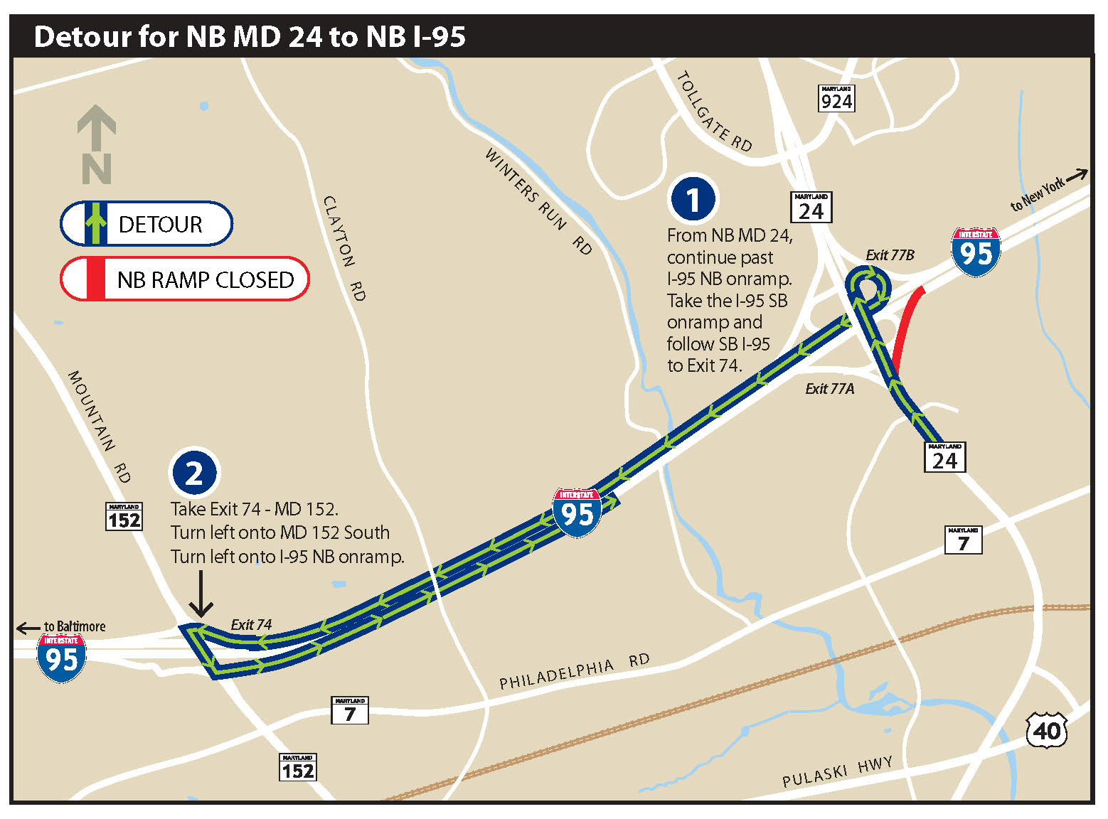 Traffic travelling northbound on MD 24 will be directed to the on-ramp to southbound I-95 and travel south to the exit to MD 152 (Exit 74), where they will make a left at the signal onto southbound MD 152 and make a left onto the on-ramp to northbound I-95.