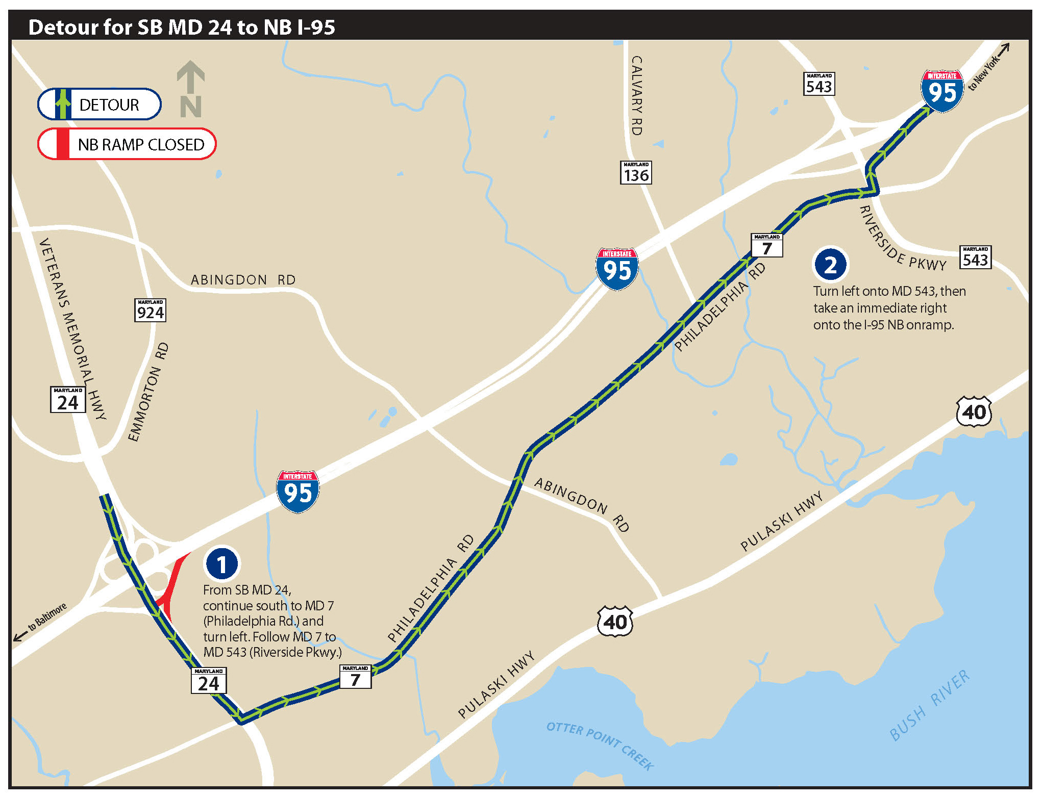 Traffic travelling southbound on MD 24 will be directed to continue straight and make a left onto MD 7 (Philadelphia Road) and travel for approximately 4 miles before making a left onto northbound MD 543 (Riverside Parkway) and making a right onto the on-ramp to northbound I-95.