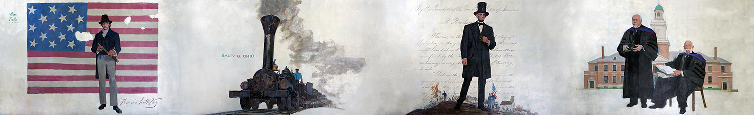 In 1966, the State Roads Commission, predecessor to the Maryland Transportation Authority, contracted with Gladieux Corporation to make decorative improvements to the Maryland House Travel Plaza on I-95 in Aberdeen, MD. Pennsylvania artist William A. Smith was commissioned to create mural panels that depicted individuals and events important to Maryland’s history. The nine-panel, oil-on-canvas murals were installed in the lobby of the Maryland House on April 2, 1968.