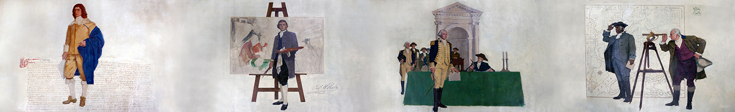 William Arthur Smith (1918-1989) was a portraitist and illustrator whose work appeared regularly in the Saturday Evening Post, Cosmopolitan, True, and other publications. In addition to painting the Maryland House historical murals, he designed 10 postage stamps, including the “Rise of the Spirit of Independence” series and the Boston Tea Party four-stamp block, which received the stamp of the year award in 1973. His portrait of Carl Sandburg is on display in the National Portrait Gallery, and additional work is in the collections of the Library of Congress, Metropolitan Museum of Art, the James A. Michener Museum, and the National Gallery of Art.