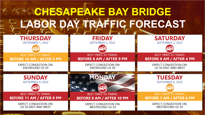 MDTA officials anticipate more than 350,000 vehicles will cross the Bay Bridge between Friday, September 2, and Labor Day Monday, September 5. Motorists should expect delays at the bridge and along the US 50 corridor during the holiday travel period. Heavier eastbound volumes are expected Thursday through Saturday, September 1-3, with heavier westbound volumes expected Sunday and Monday, September 4-5. Motorists should stay on US 50 on both sides of the bridge to keep local roadways open for first responders and residents.
