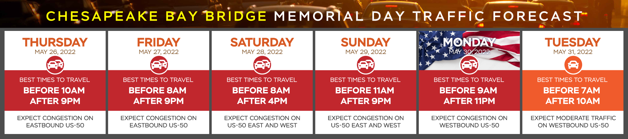 MDTA officials anticipate more than 330,000 vehicles to cross the Bay Bridge between Friday, May 27, and Monday, May 30, and motorists should expect delays at the bridge and along the US 50 corridor during the holiday travel period. Heavier eastbound traffic volumes are expected Thursday, May 26, through Saturday, May 28, with heavier westbound traffic volumes expected to build Sunday, May 29, and Monday, May 30. Motorists should stay on US 50 on both sides of the bridge to keep local roadways open for first responders and residents.