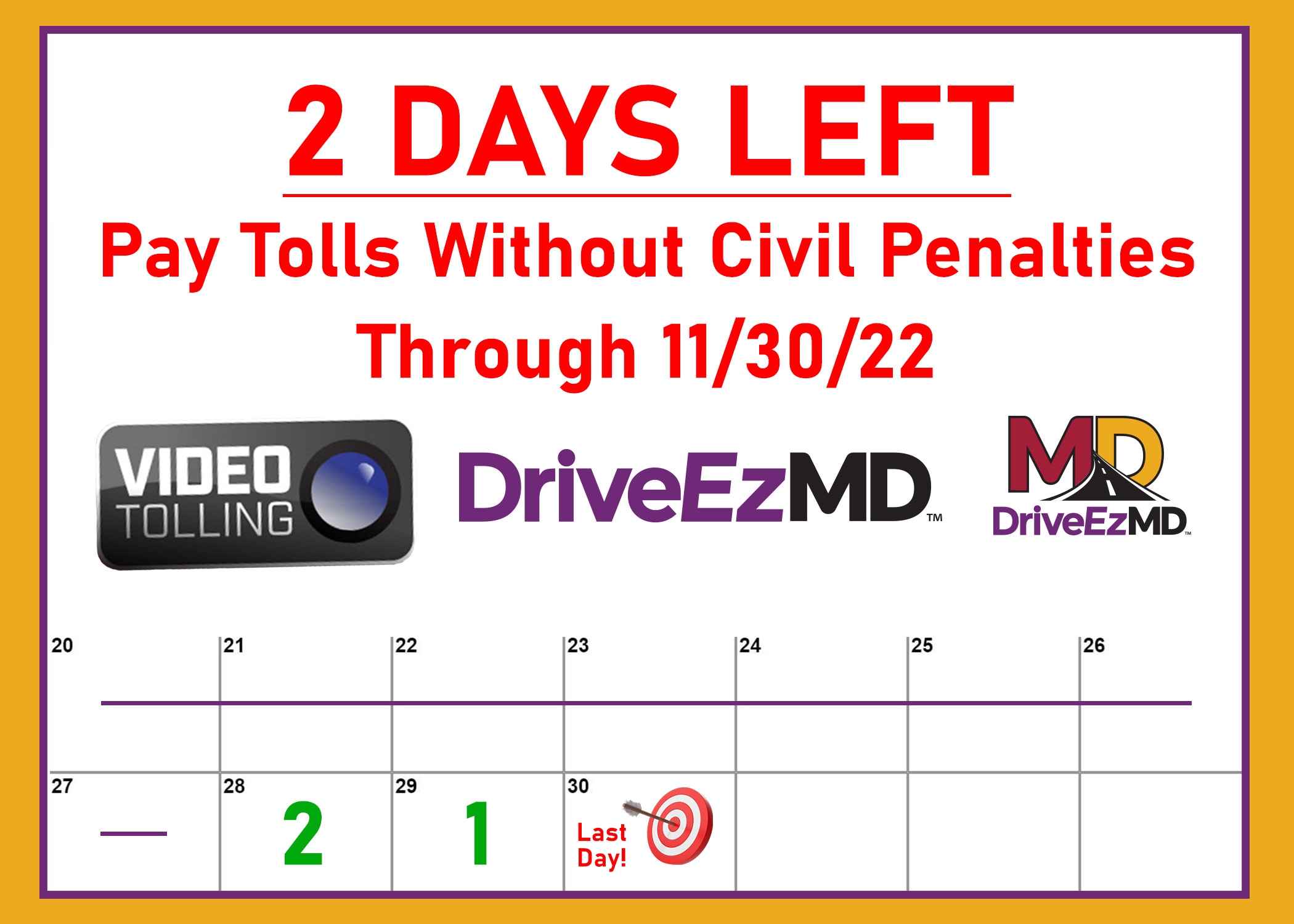 BALTIMORE, MD (November 28, 2022) – The Maryland Transportation Authority (MDTA) reminds all customers that just two days remain in the Customer Assistance Plan that offers a civil penalty waiver grace period for Video Tolls. The plan has been in effect for nine months, and as this limited-time opportunity reaches its final hours, the MDTA urges customers to take advantage by paying unpaid Video Tolls now and make sure they are paid in full by 11:59 p.m. November 30, 2022.